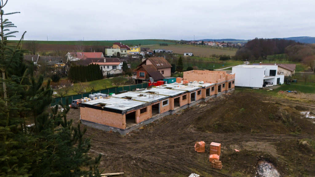 Výstavba projektu Řadové domy Sušice pokračuje i v novém roce naplno. Dokončeny jsou předpjaté stropní panely SPIROLL, vnitřní schodiště od PREFY a aktuálně probíhá vyzdívání druhých podlaží systémem HELUZ, díky čemuž domy rychle získávají své jasné obrysy. Projekt tak postupuje podle harmonogramu a opět je o krok blíže k předání budoucím majitelům.